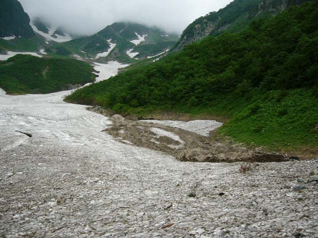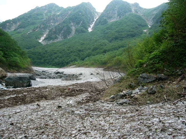 曲沢を過ぎると雪渓の上に土砂が流れている場所を通ります。