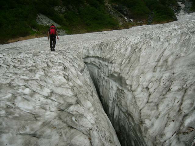 雪渓の左岸よりを歩きますが、ところどころクレバスが開いているので注意が必要です。