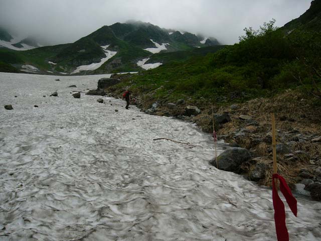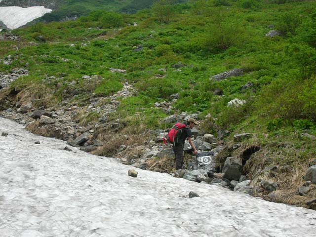 しばらく雪渓を進むと、大岩の手前で夏道が現れますから、そちらへ取り付いてください。