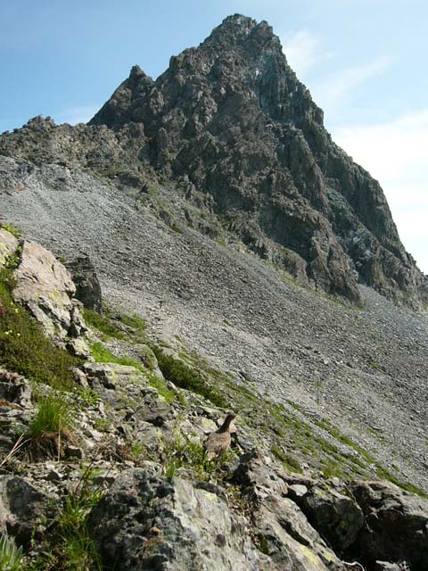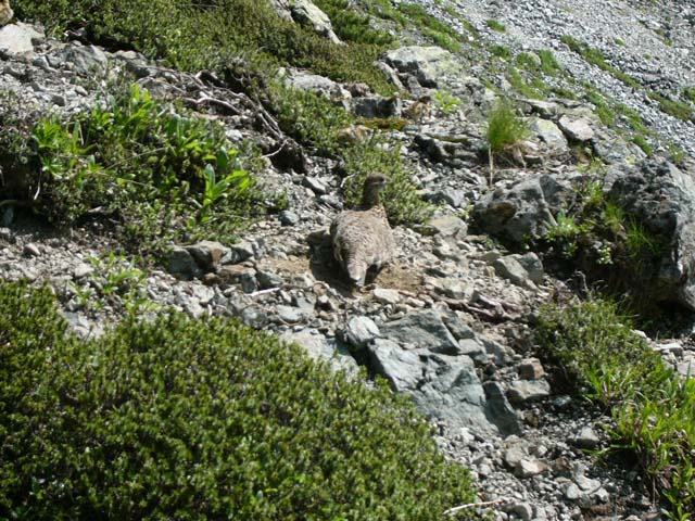 ようやく夏らしい天気になってきました。 雷鳥が、槍ケ岳山荘前で、砂浴びをしたり、散歩をしていました。 昨年は、登山道で砂浴びをしていましたので、同じ雷鳥かも知れません。 朝の登山者の少ない頃でしたが、最盛期に小屋付近で遊ぶ雷鳥が出現するとは、 熊や、サルと同様、雷鳥も人に鈍感になってきているのかもしれません。 槍ケ岳南岳間の雷鳥出現マップが、南岳小屋のホームページにありますので、 ご興味のある方は、覗いて見てください。 槍ケ岳山荘 穂苅康治