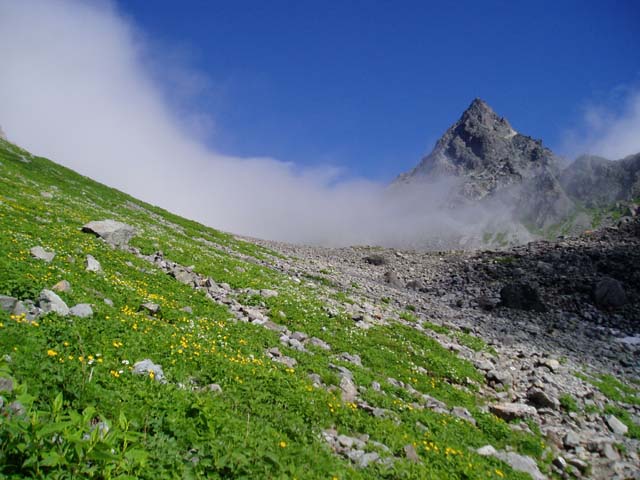 昨日の槍ケ岳のお花畑は、台風前の好天に恵まれ、霧のはいり具合もよく幻想的な一