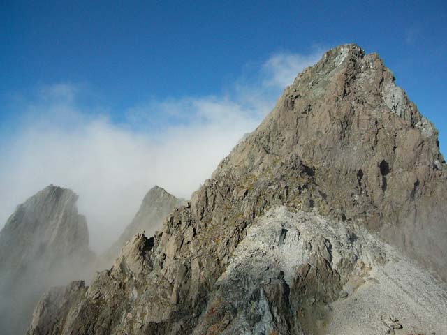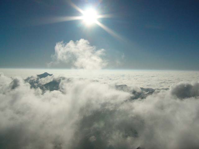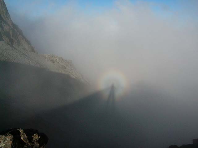 移動性の高気圧に覆われて、午後からは雲が下がり、まぶしいほどの青空が広がりました。 午後の傾いた日差しが、槍沢に漂うガスに影を映し、ブロッケンが現れました。 上空は青空、眼下は雲海で遠くまで広がっています。 穏やかな午後になりました。 槍ヶ岳山荘 山口信吉
