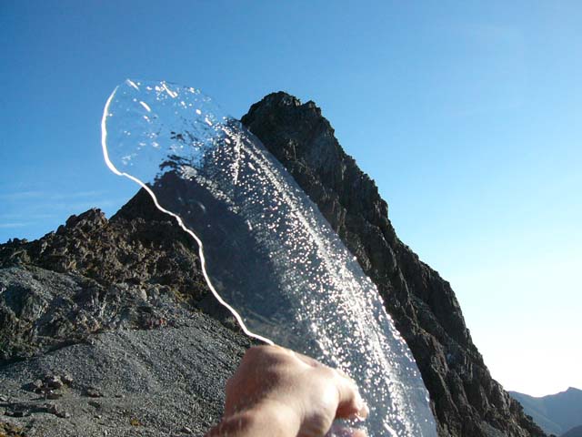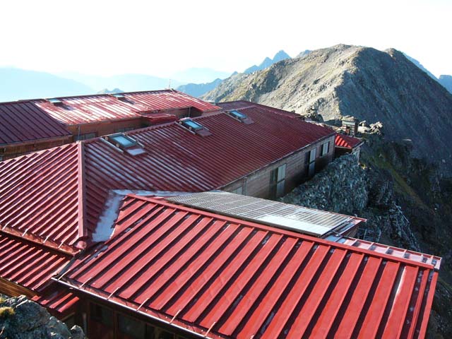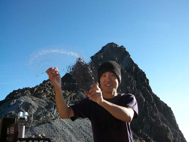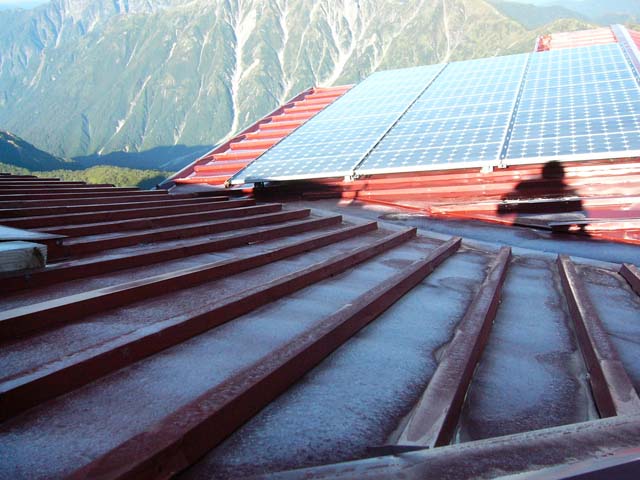 昨夜はよく晴れ渡り、星がきれいな穏やかな夜でした。 放射冷却で、今朝の最低気温は1.9℃と冷え込みました。 山荘の屋根やテーブルは霜がはりつき、水槽の上の水溜りには氷が張っていました。 今年初めての氷です。 これからは朝晩の気温が下がり、冷え込みますので防寒具はしっかりと用意してお出かけください。 槍ヶ岳山荘 山口信吉