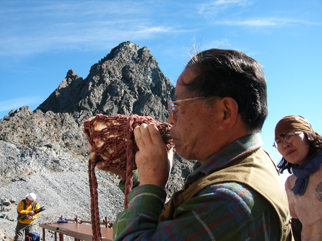 福岡県からお越しの井上辰彦さんは日本三大霊峰「英彦山」の案内人です。 今日は英彦山でいつも吹いているほら貝を背負って槍ヶ岳に登られました。 槍ヶ岳山頂から播隆上人を偲び吹くほら貝の音は山の頂から谷間まで力強く 響き渡りました。 山荘前では登山者の安全と山荘従業員の健康を祈念して吹いていただきました。 ありがとうございました。 槍ケ岳山荘 山口信吉